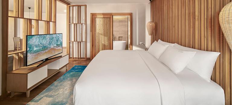 - Nội thất và thiết kế: Tất cả các phòng đều được trang bị nội thất hiện đại, chất lượng cao, kết hợp ban công rộng rãi hướng biển, mang đến trải nghiệm nghỉ dưỡng sang trọng và thư giãn.