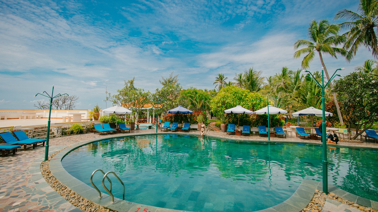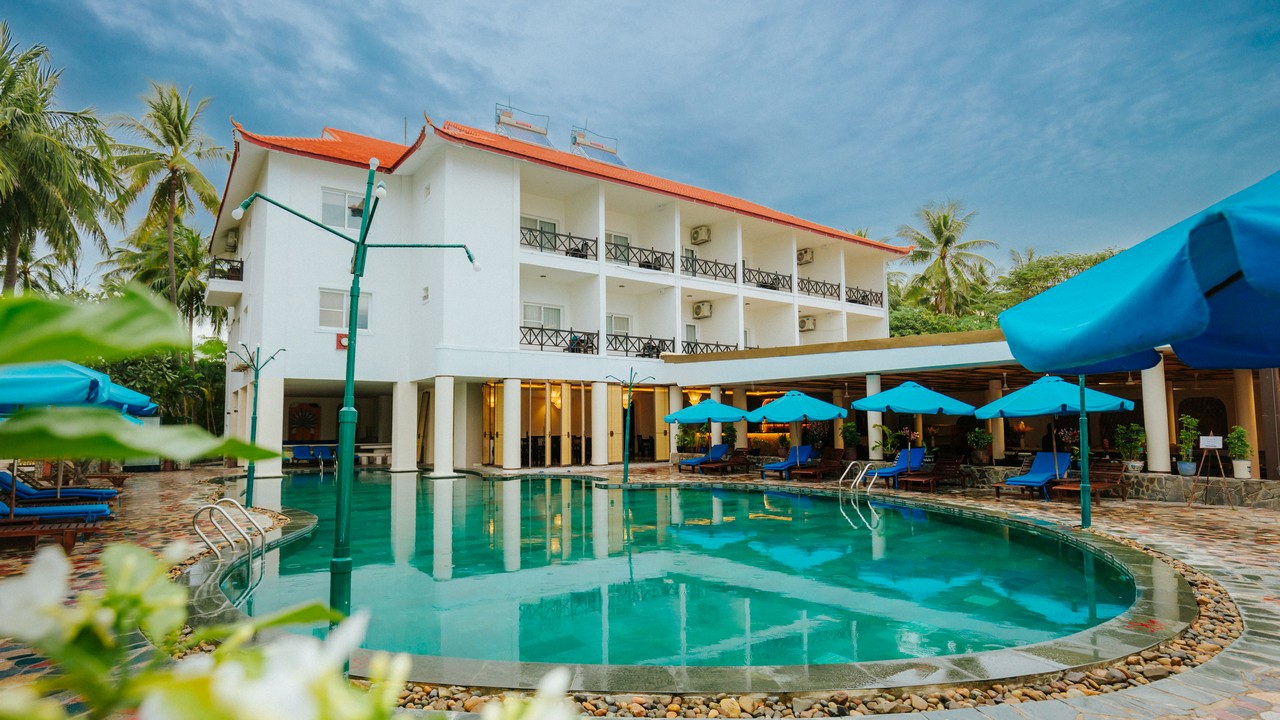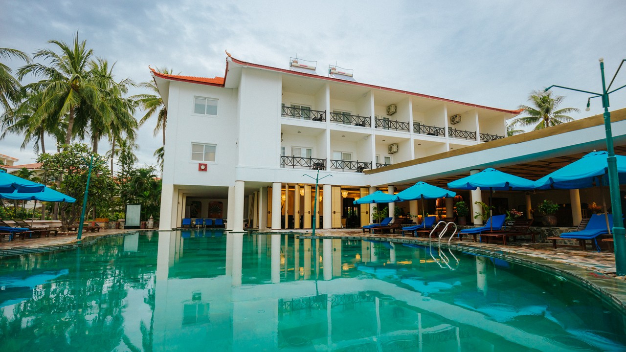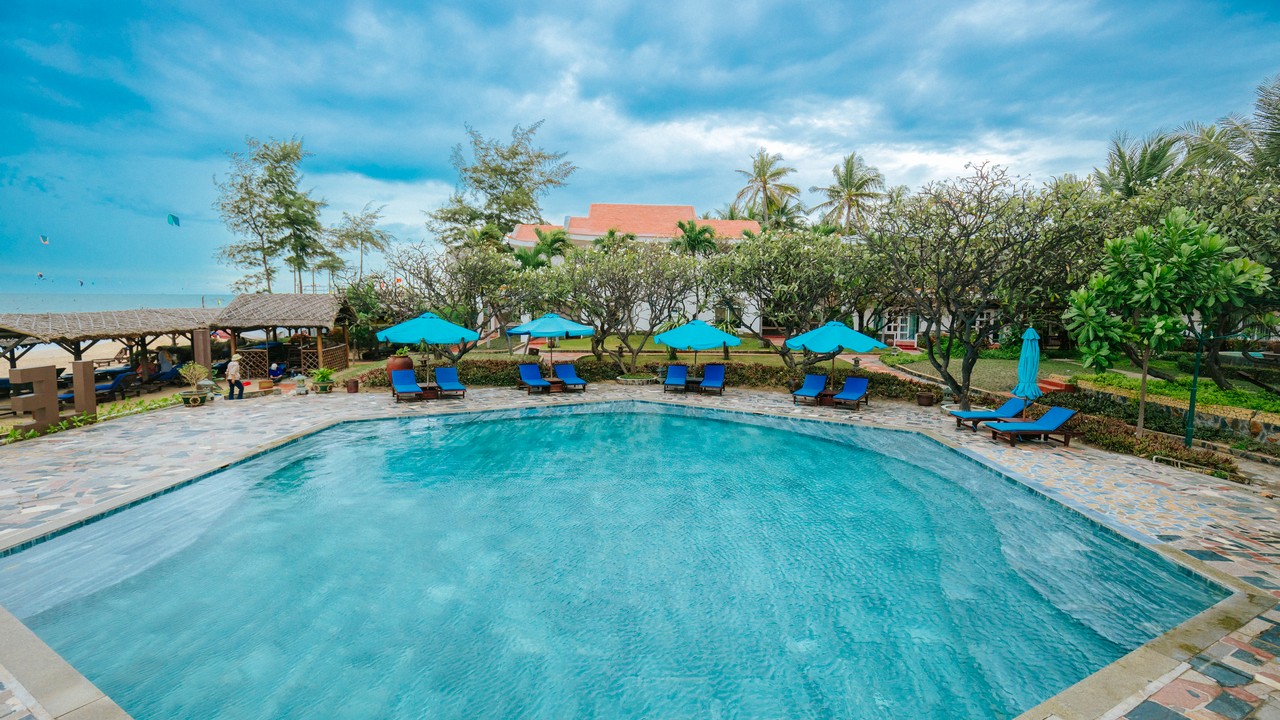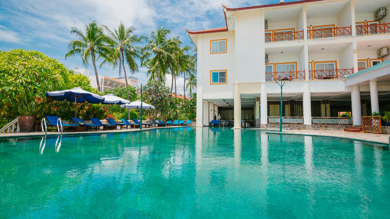 khách sạn có 2 hồ bơi, bãi biển sạch đẹp, tuy nhiên lúc đi xuống biển sẽ hơi dốc, xuống tới nơi thì cát lài lài ra tắm đc bình thường nhé. ăn sáng buffee nhiều món, mình ở căn bungalow cây cối sân vườn rất đẹp. giá oke so với khu Nguyễn Đình Chiểu
