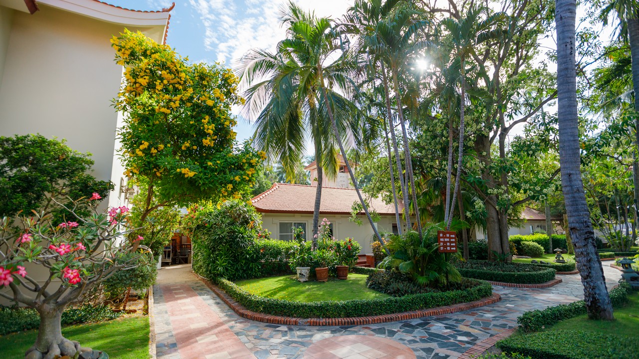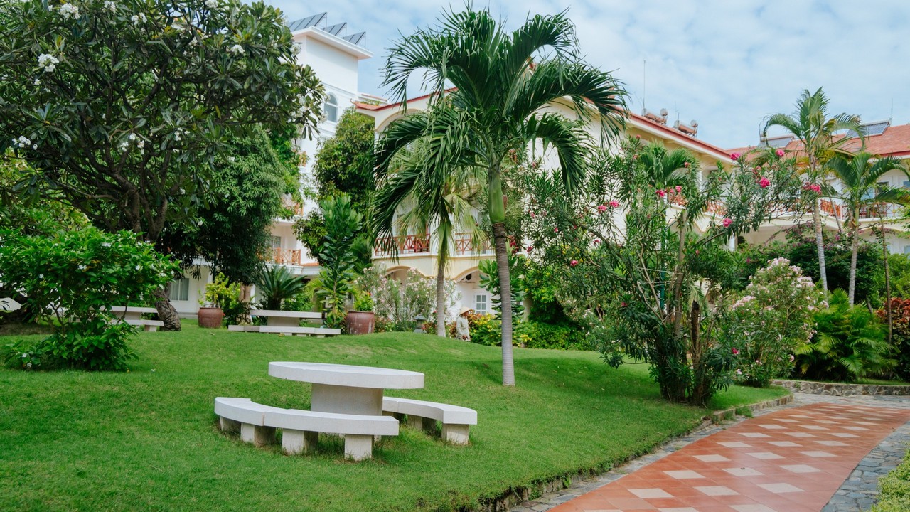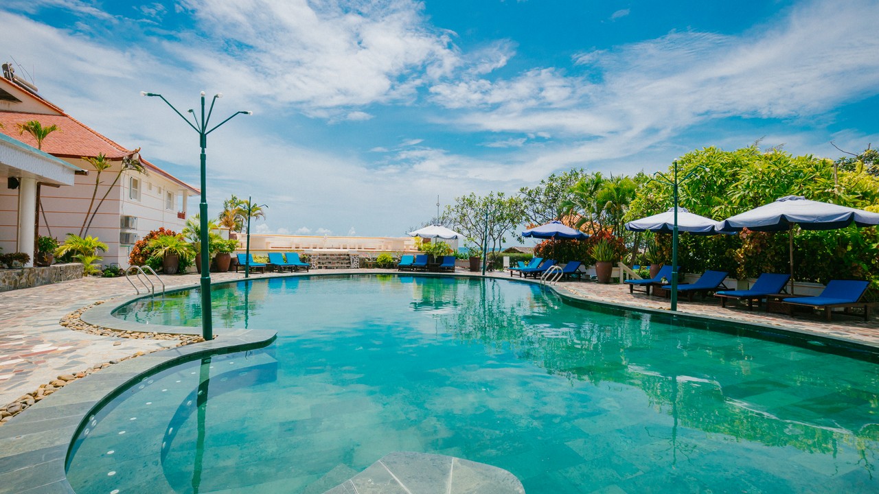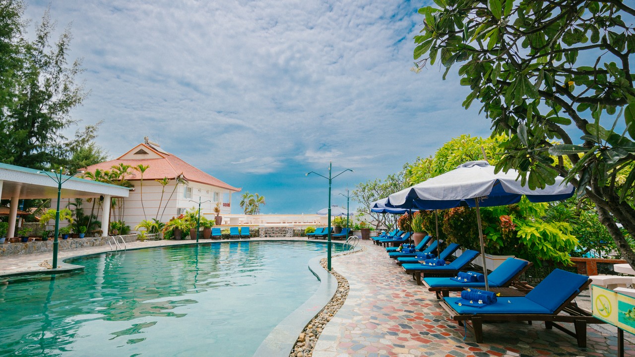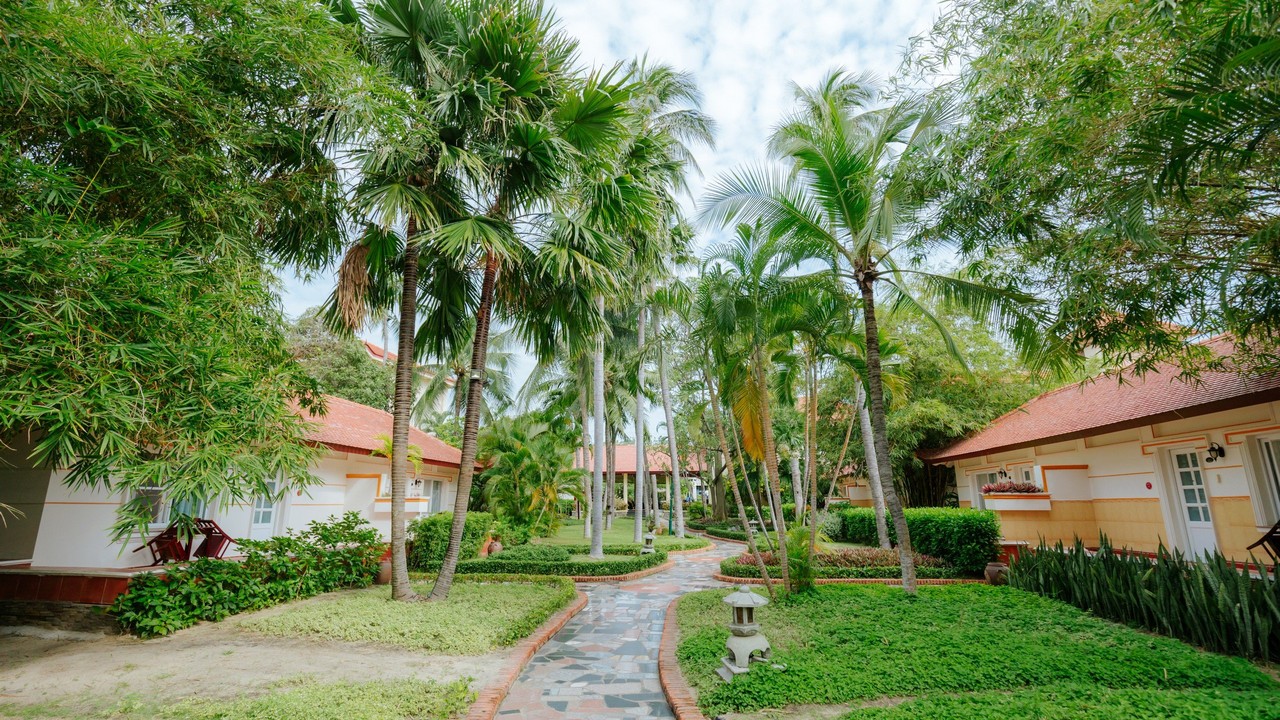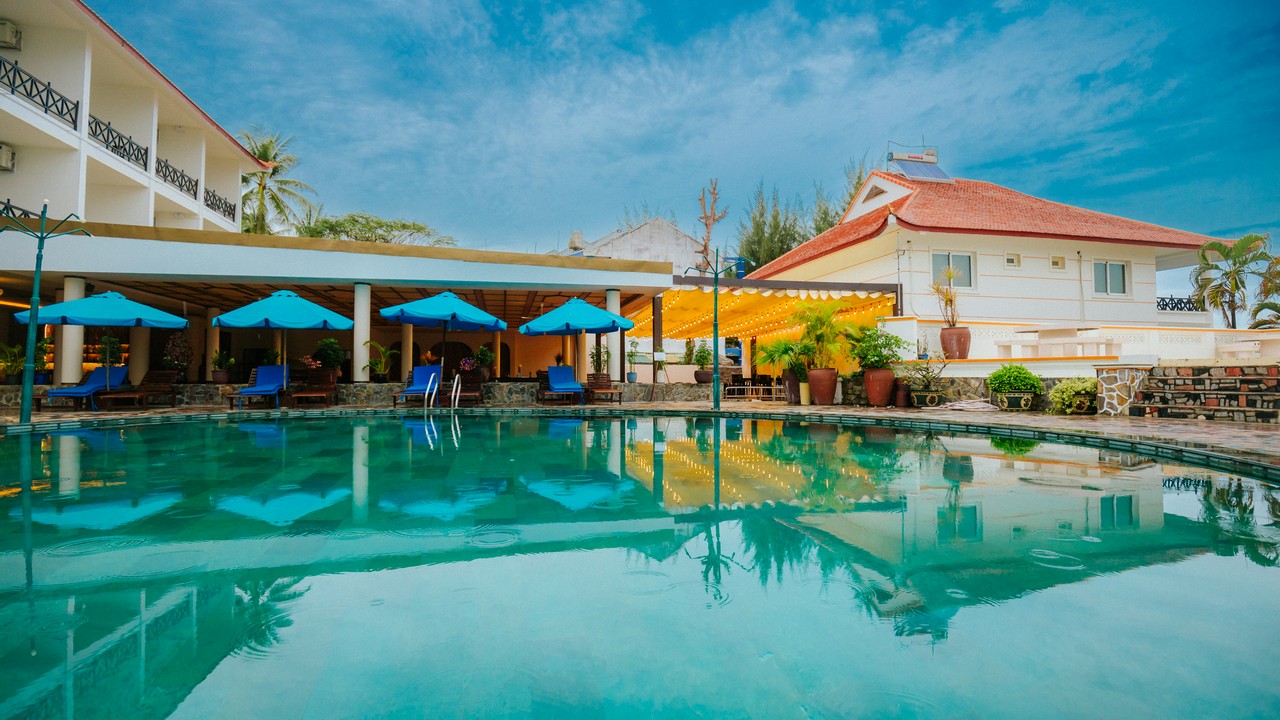 khách sạn có 2 hồ bơi, bãi biển sạch đẹp, tuy nhiên lúc đi xuống biển sẽ hơi dốc, xuống tới nơi thì cát lài lài ra tắm đc bình thường nhé. ăn sáng buffee nhiều món, mình ở căn bungalow cây cối sân vườn rất đẹp. giá oke so với khu Nguyễn Đình Chiểu